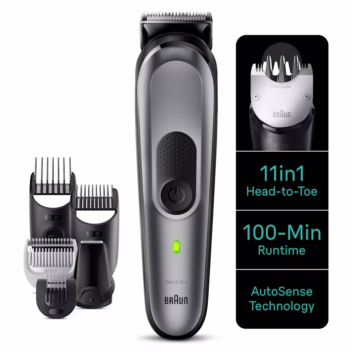 Braun’s 11-in-1 Style Kit for head-to-toe grooming: curated tools for beard, ear & nose trimming, hair clipping and manscaping your whole body.